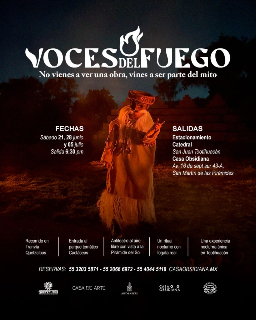Voces del Fuego es un espectáculo al aire libre que mezcla teatro, música en vivo, sombras y leyendas vivas. Inspirado en el mito prehispánico del Tlacuache y el origen del fuego, esta obra convierte al público en parte del ritual.